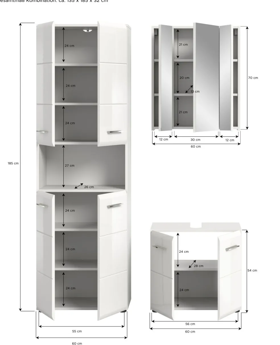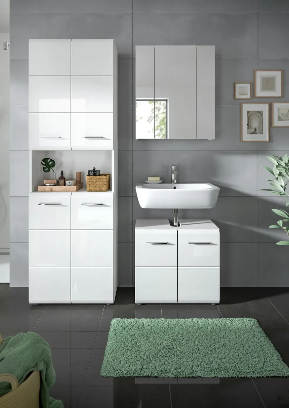 1 colonne de salle de bains avec 4 portes, 3 tablettes amovibles et 1 casier ouvert