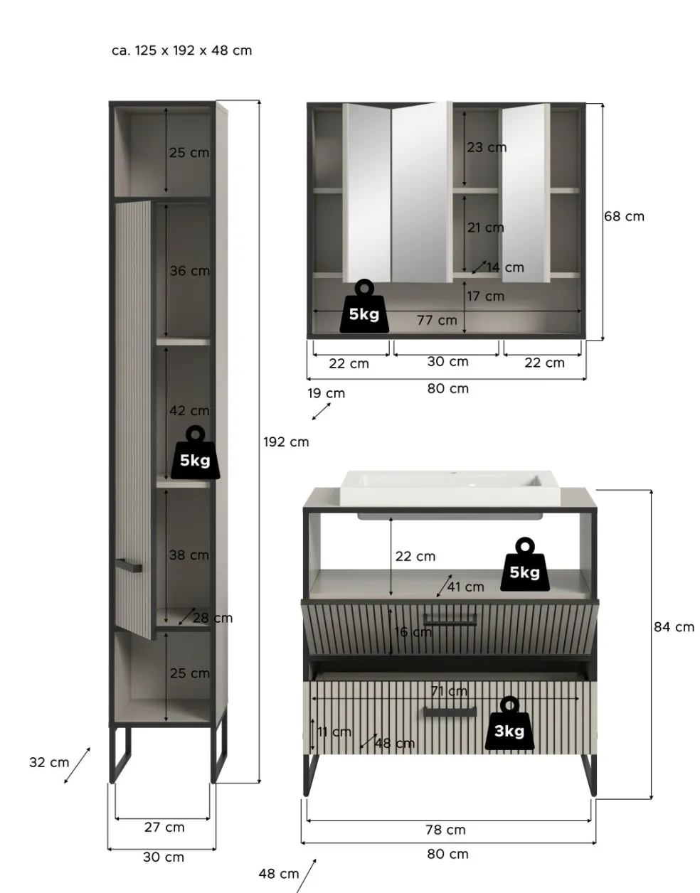 | Meuble sous vasque avec vasque | 80 | 84 | 48 |