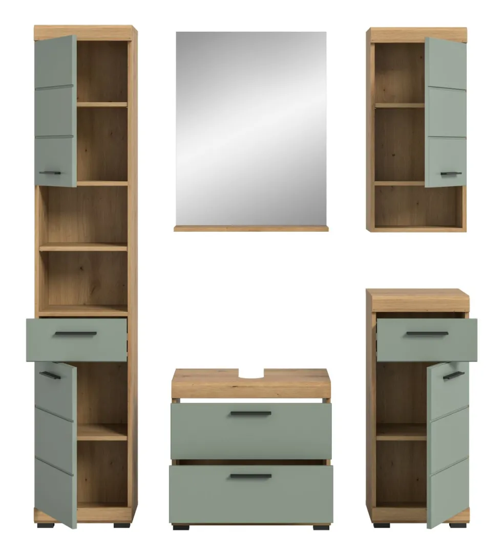 1 colonne de salle de bains avec 2 portes, 1 tiroir, 2 casiers ouverts, 2 tablettes fixes et 3 tablettes amovibles