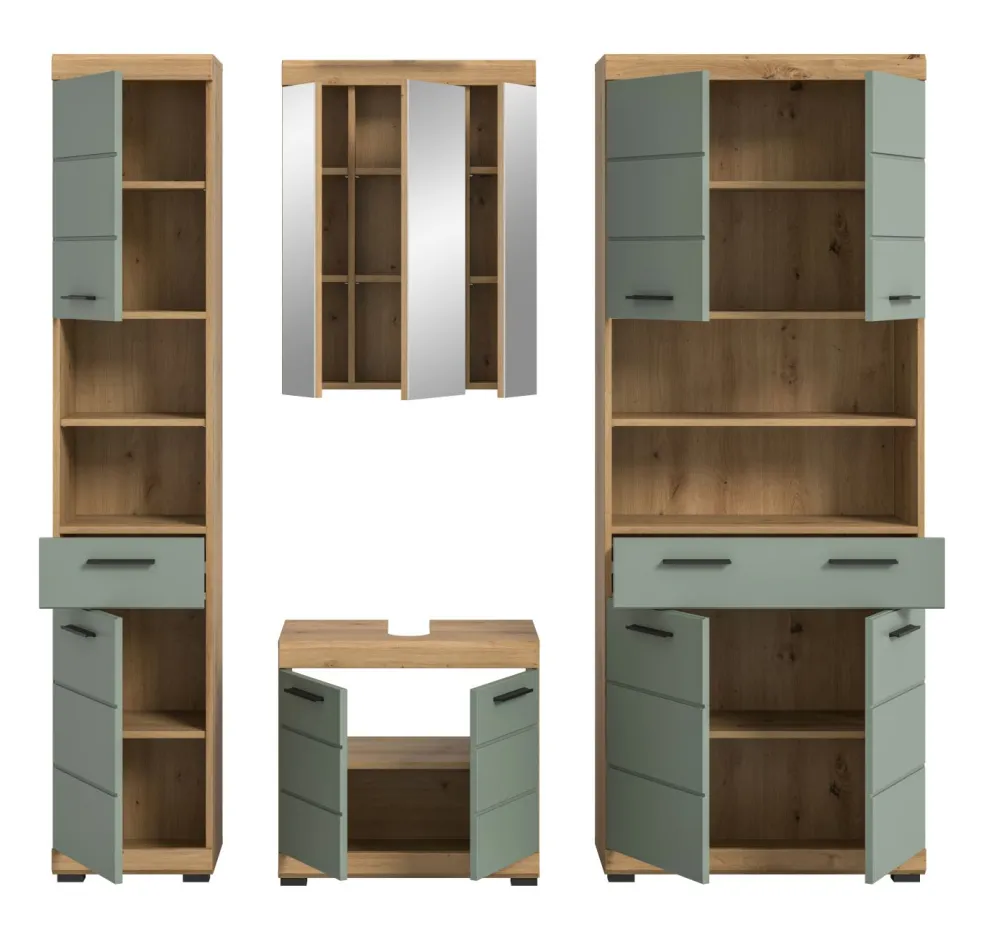1 colonne de salle de bains avec 2 portes, 1 tiroir, 2 casiers ouverts, 2 tablettes fixes et 3 tablettes amovibles