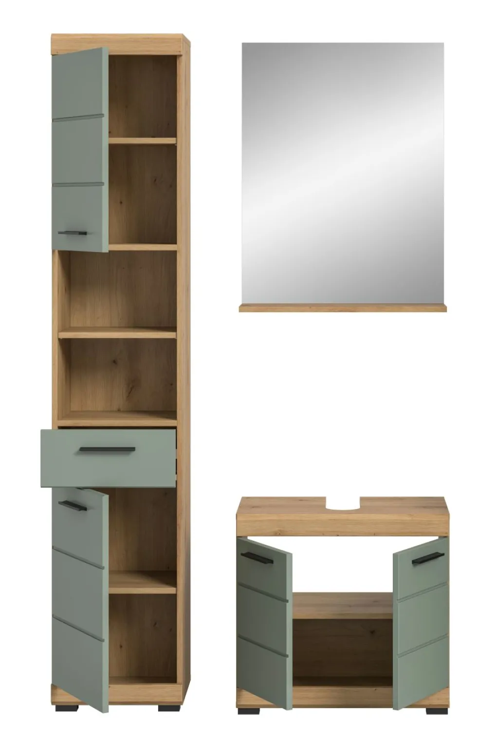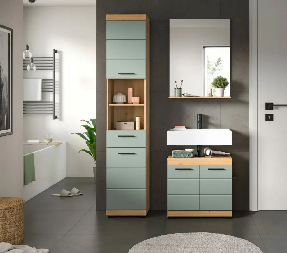 1 colonne de salle de bains avec 2 portes, 1 tiroir, 2 casiers ouverts, 2 tablettes fixes et 3 tablettes amovibles