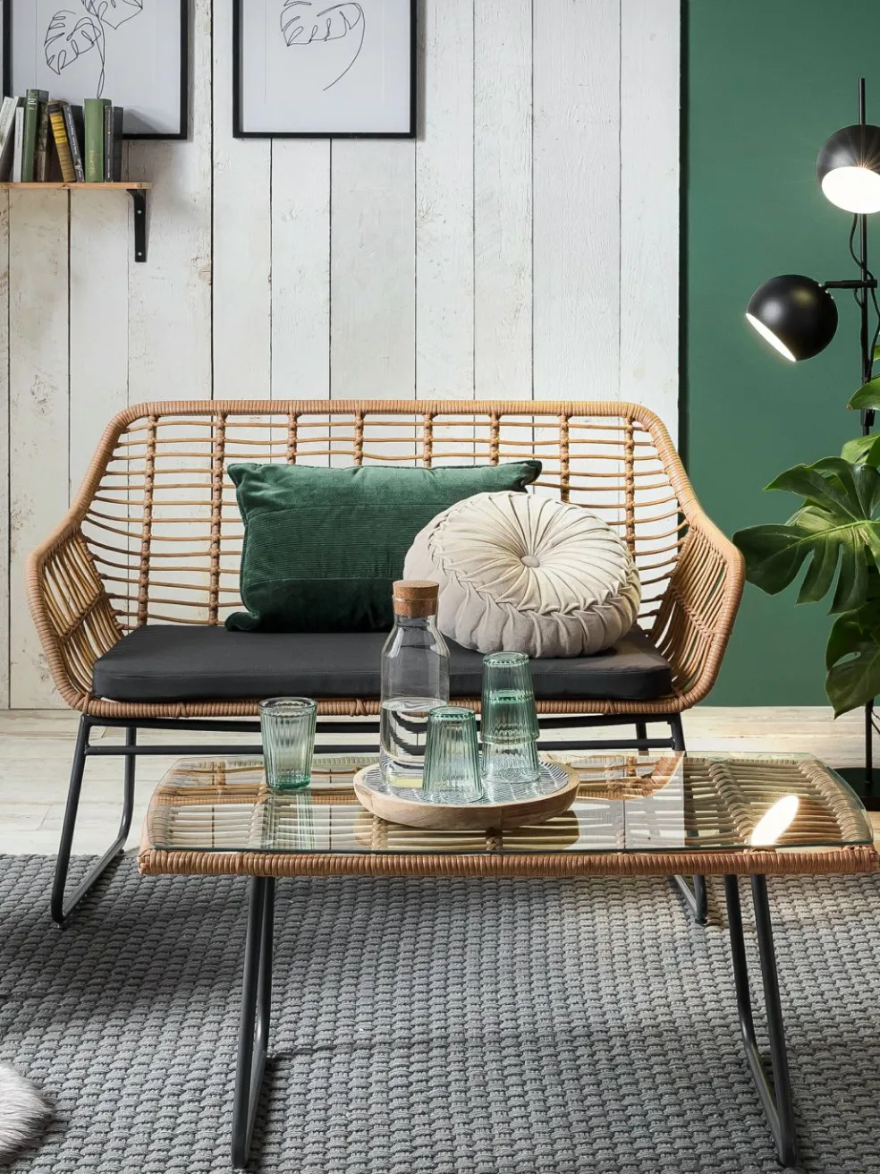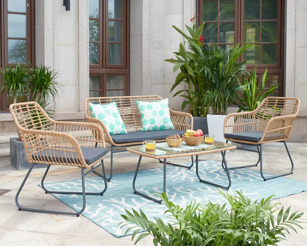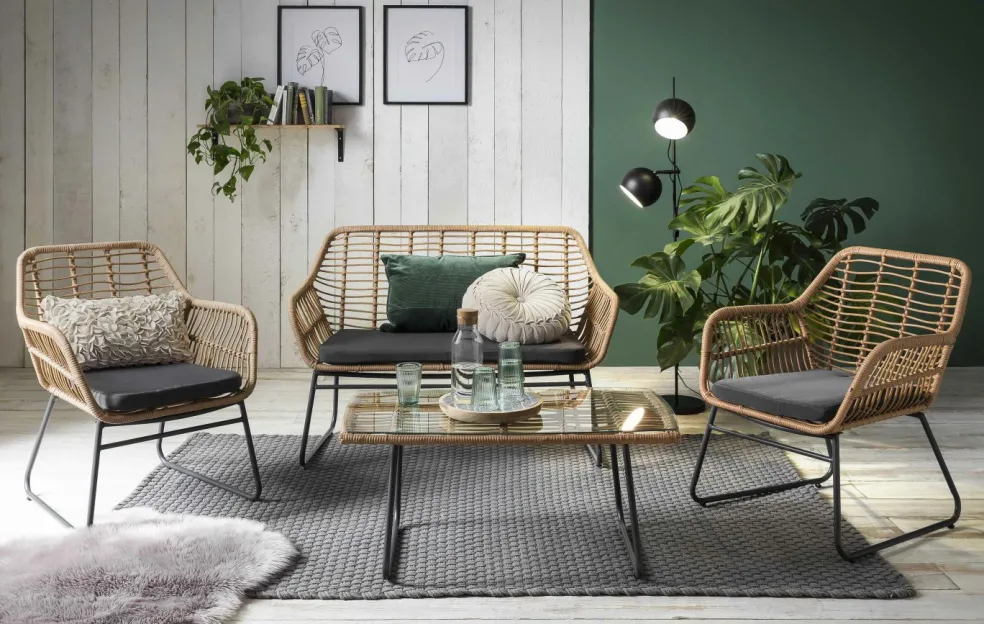 Banquette, table et chaises en poly rotin ton naturel