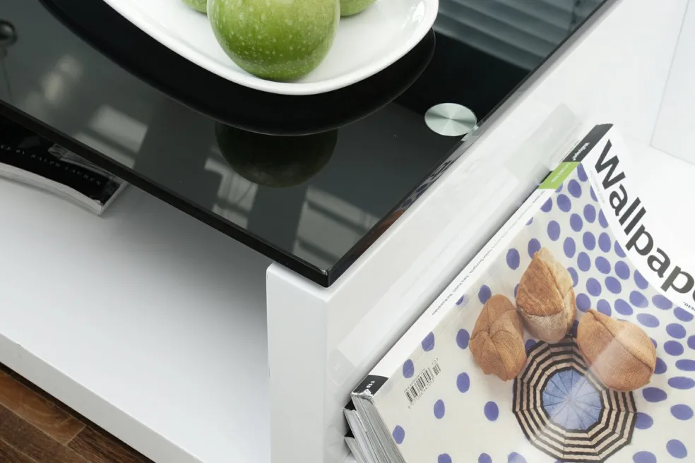 MDF (panneaudefibresde bois demoyenne densité) laqué ton blanc ultra brillant avec plateau de table en verre de sécurité