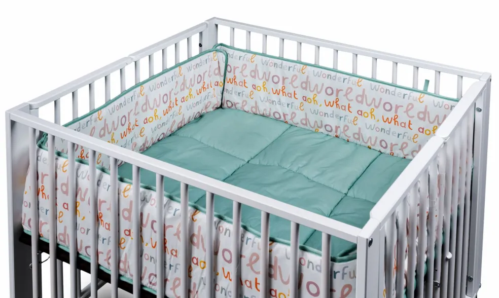 Le tapis moelleux en coton naturel avec garnissage en polyester s’attache aux barreaux du parc grâce aux nouettes.