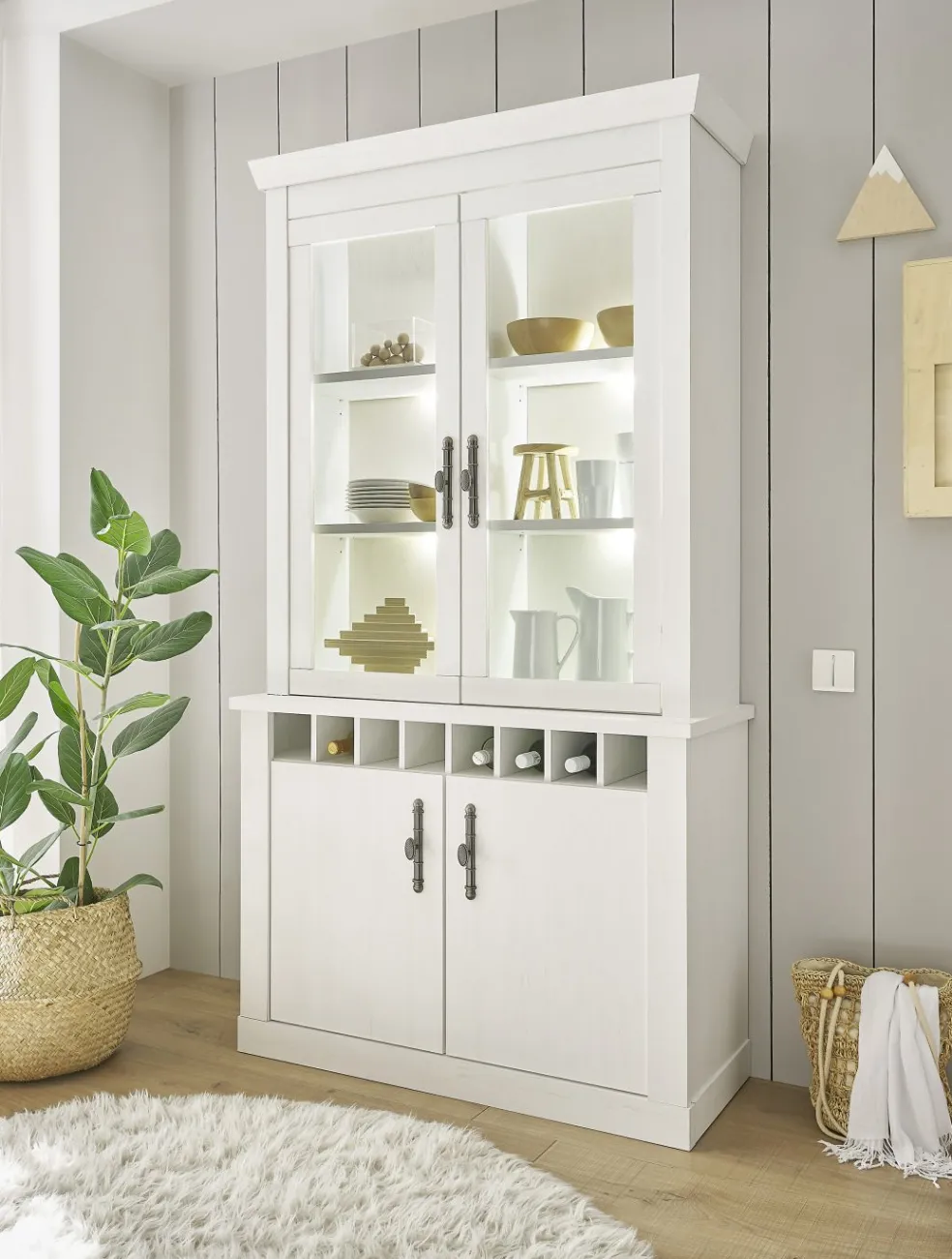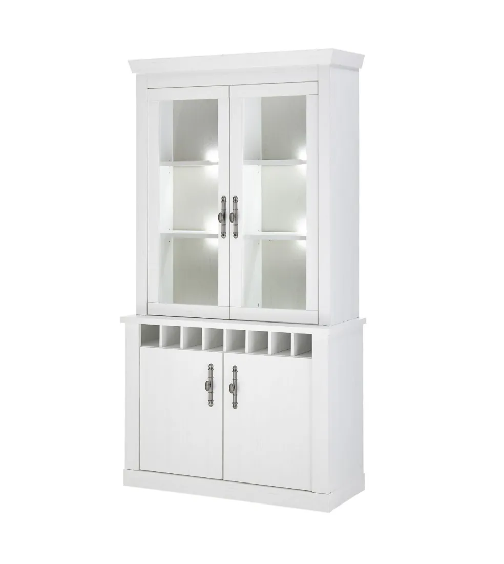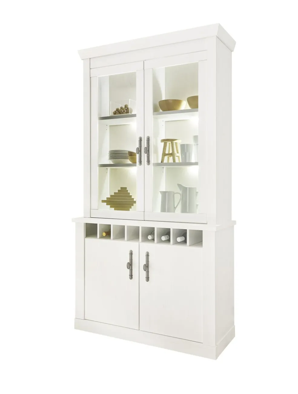 Partie supérieure comprenant 2 portes en verre avec encadrement et, derrière chacune d’elles, 2 tablettes en verre
