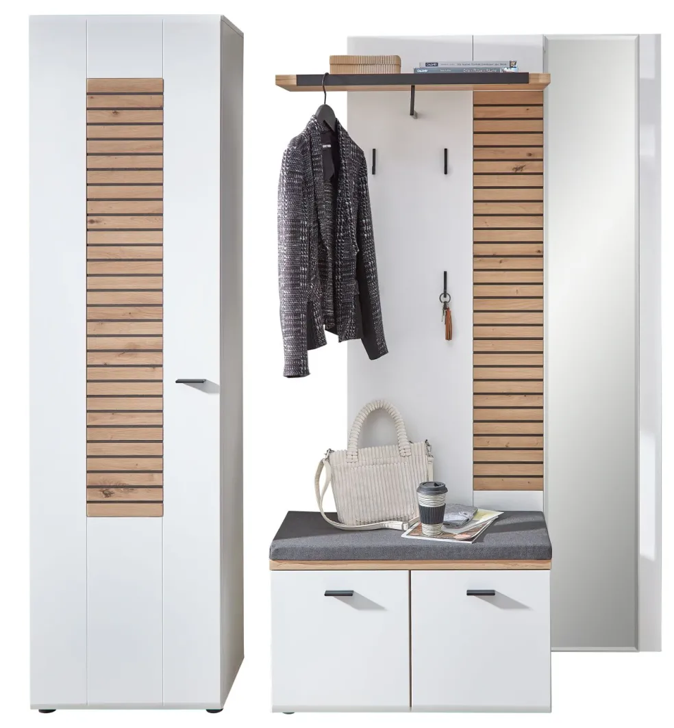 Façade: MDF (panneau de fibres de bois de densité moyenne) ton blanc mat et contrastes MDF décor chêne Artisan aspect lattes de bois