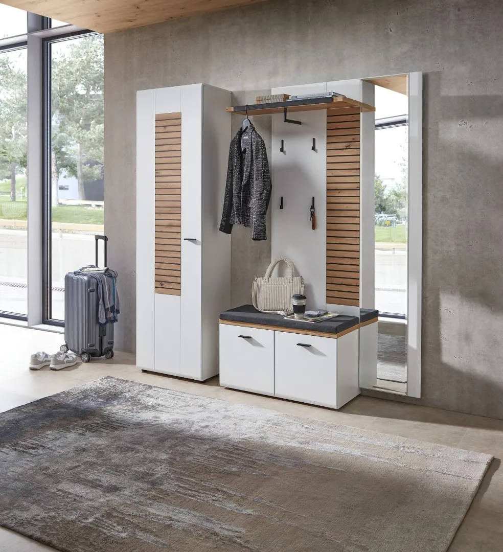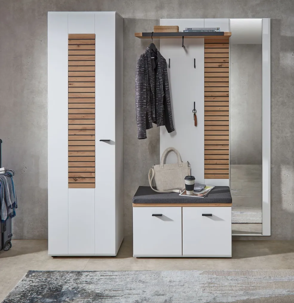 1 armoire d’entrée avec 1 porte, 1 tablette fixe avec barre de penderie extensible et 3 tablettes