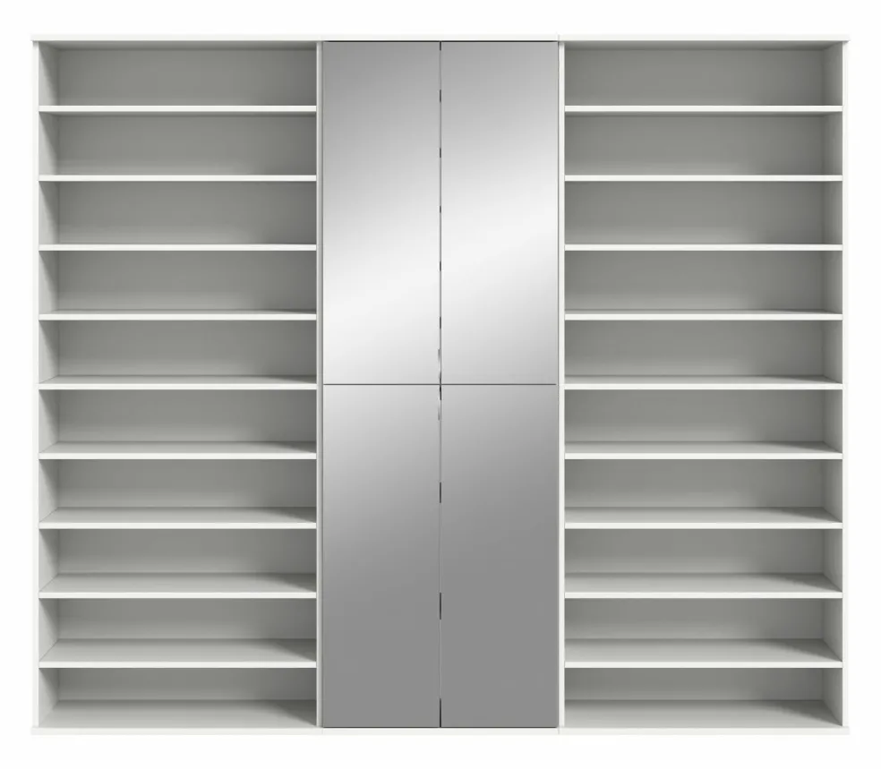 1 armoire d’entrée avec 2 portes miroir, 7 tablettes amovibles, 1 tablette fixe et 1 barre de penderie