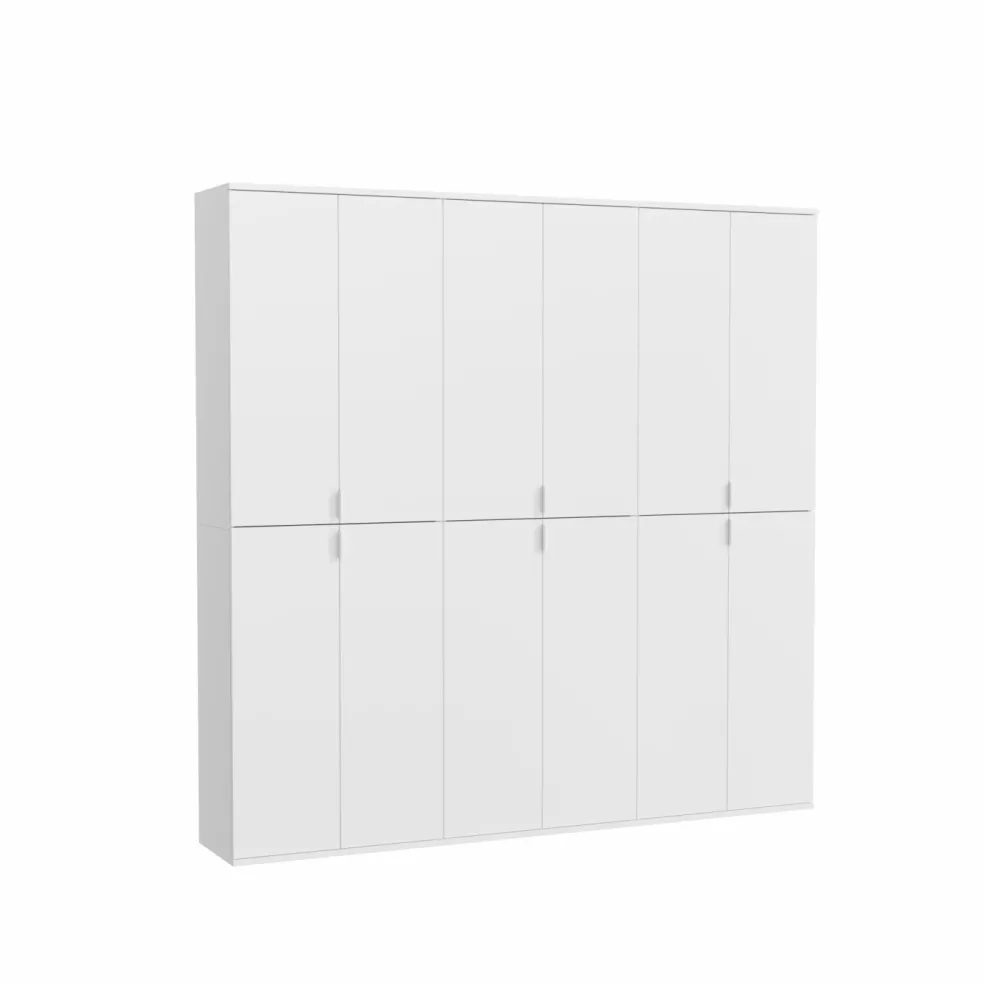 3armoires d’entrée comprenant chacune 2 portes ton blanc ultra brillant, 7 tablettes amovibles, 1 tablette fixe et 1 barre de penderie