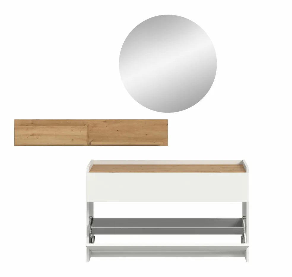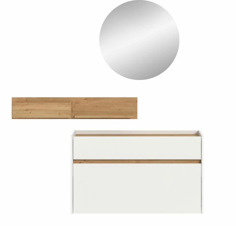 Façade: ton blanc et décor chêne Artisan / miroir