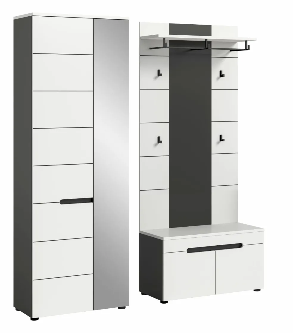 1 armoire d’entrée avec 2 portes (dont 1 porte avec miroir), 1 tablette fixe, 1 barre de penderie et 4 tablettes amovibles