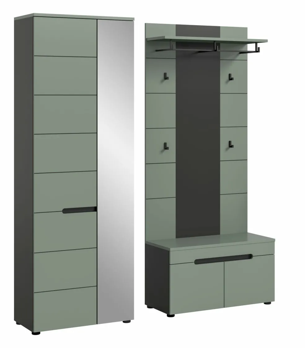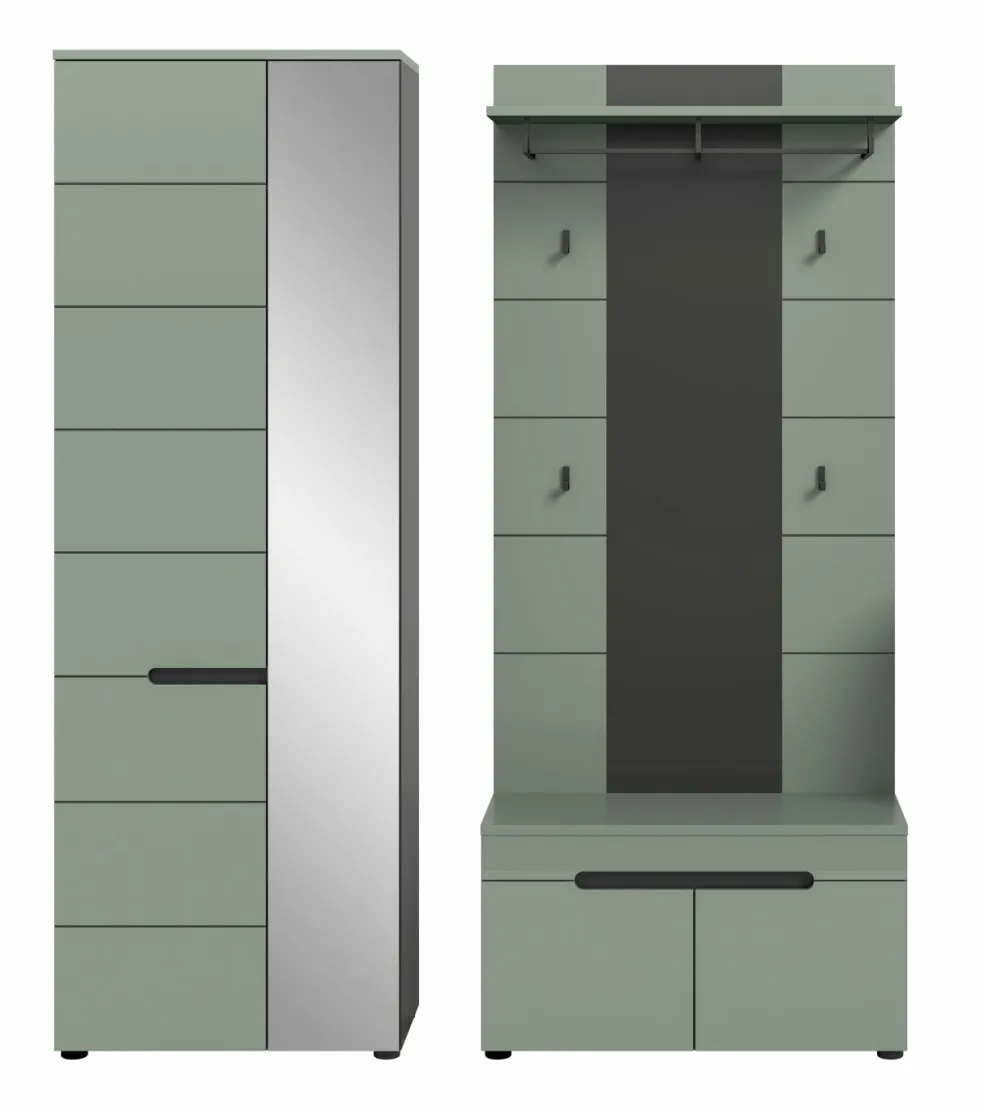 1 armoire d’entrée avec 2 portes (dont 1 porte avec miroir), 1 tablette fixe, 1 barre de penderie et 4 tablettes amovibles