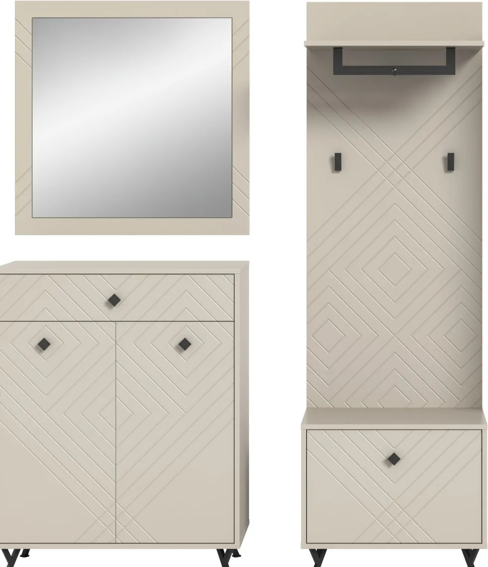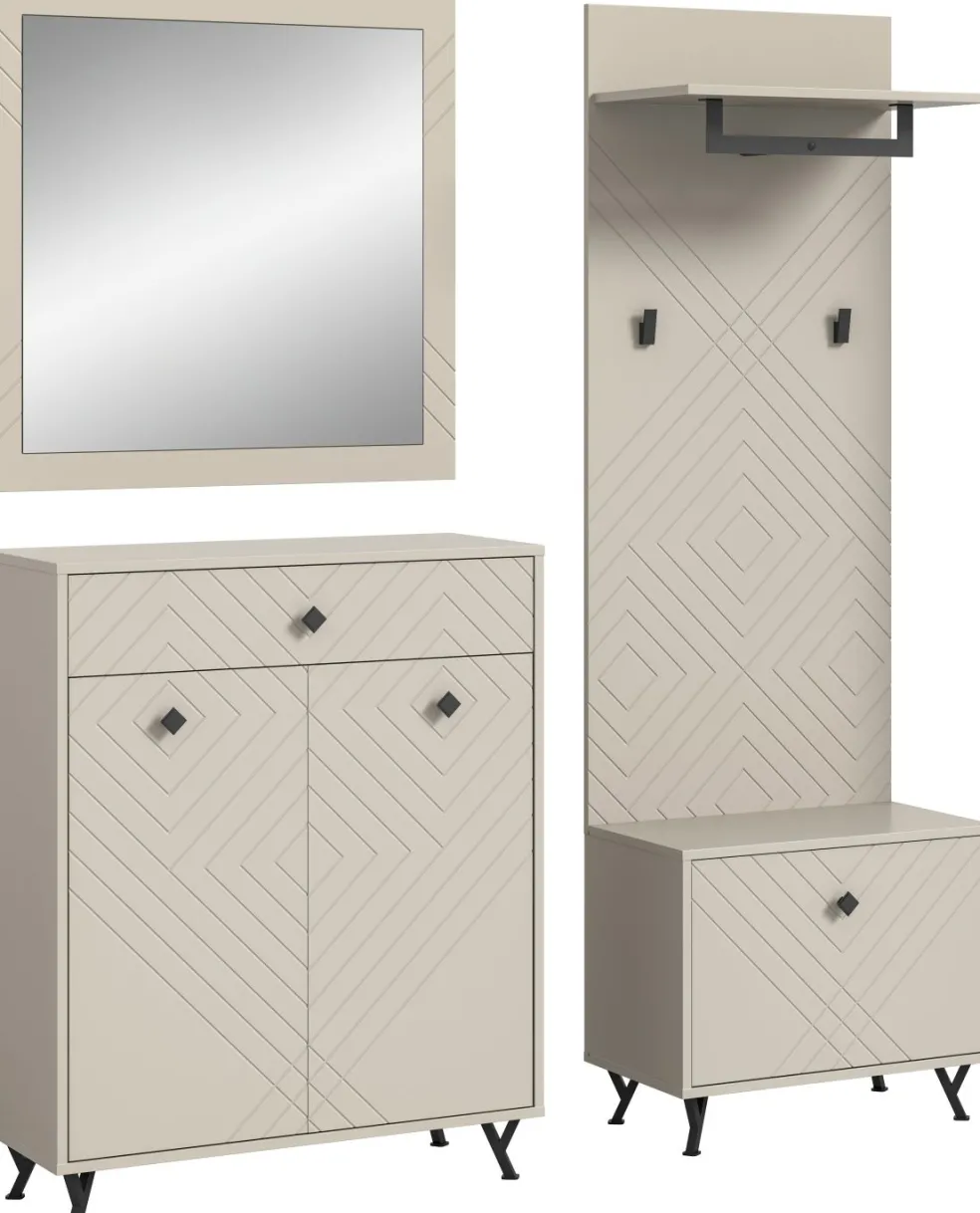 Façade: MDF (panneaux de fibres de bois de densité moyenne) thermoformé ton beige sable mat / miroir