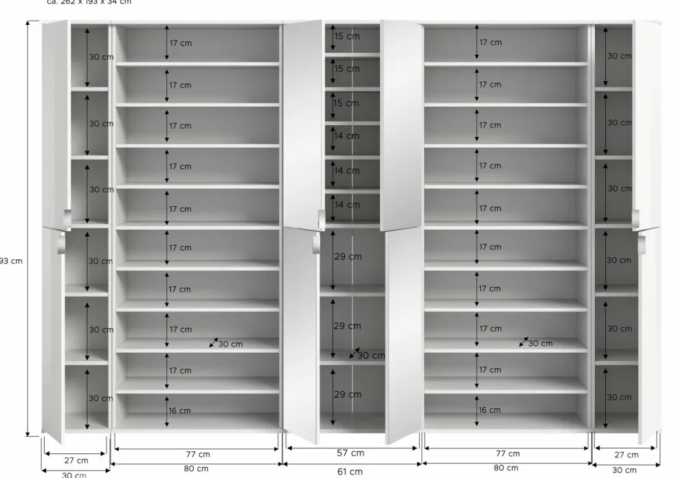 2 étagères à chaussures avec 8 tablettes amovibles et 1 tablette fixe chacune