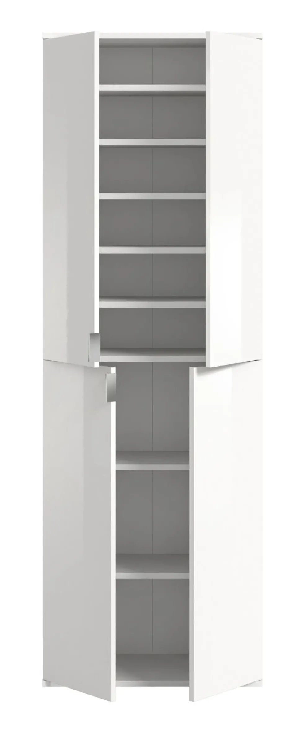 1 armoire d’entrée comprenant 2 portes ton blanc ultra brillant, 7 tablettes amovibles, 1 tablette fixe et 1 barre de penderie