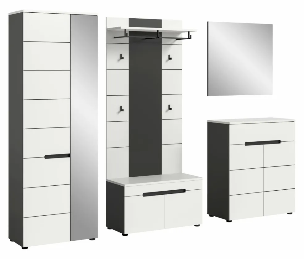 1 armoire d’entrée avec 2 portes (dont 1 porte avec miroir), 1 tablette fixe, 1 barre de penderie et 4 tablettes amovibles
