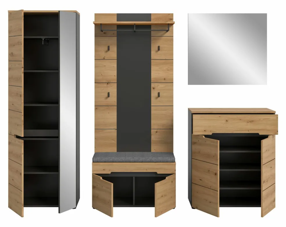 1 armoire d’entrée avec 2 portes (dont 1 porte avec miroir), 1 tablette fixe, 1 barre de penderie et 4 tablettes amovibles