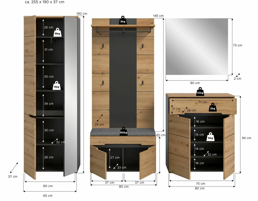 | Armoire d’entrée | 65 | 190 | 37 |
