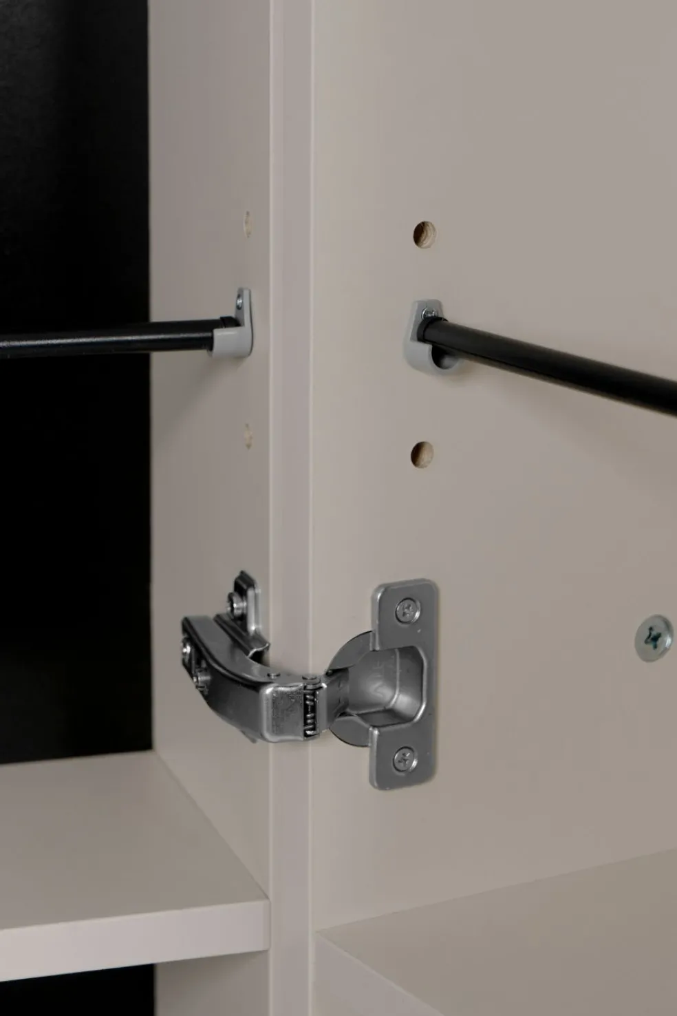 2 portes avec, derrière chacune d’elles, 4 tablettes amovibles et 5 barres en matière synthétique pour bloquer les chaussures