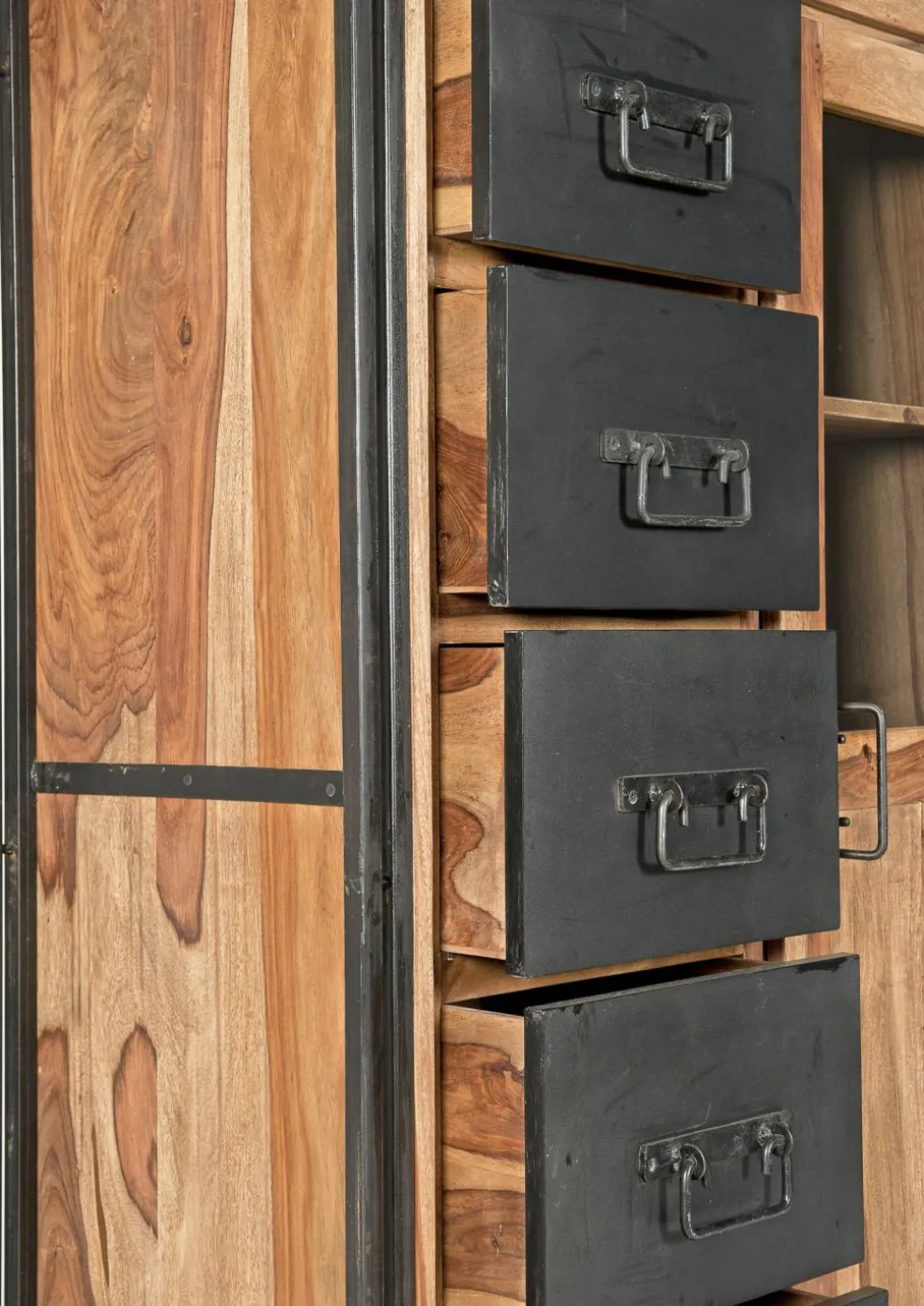 acacia massif (Inde) teinté et huilé avec métal vieilli ton noir patiné