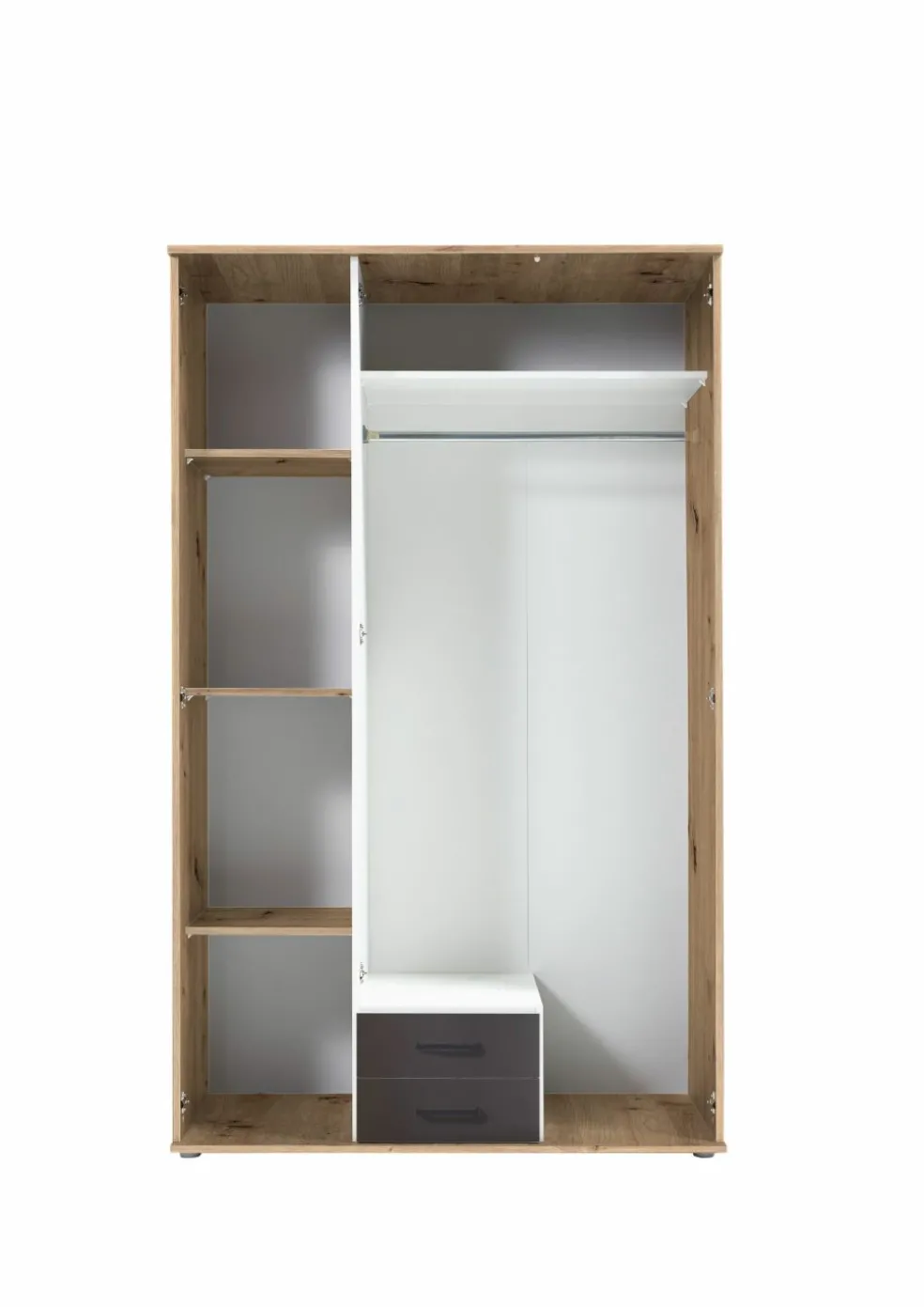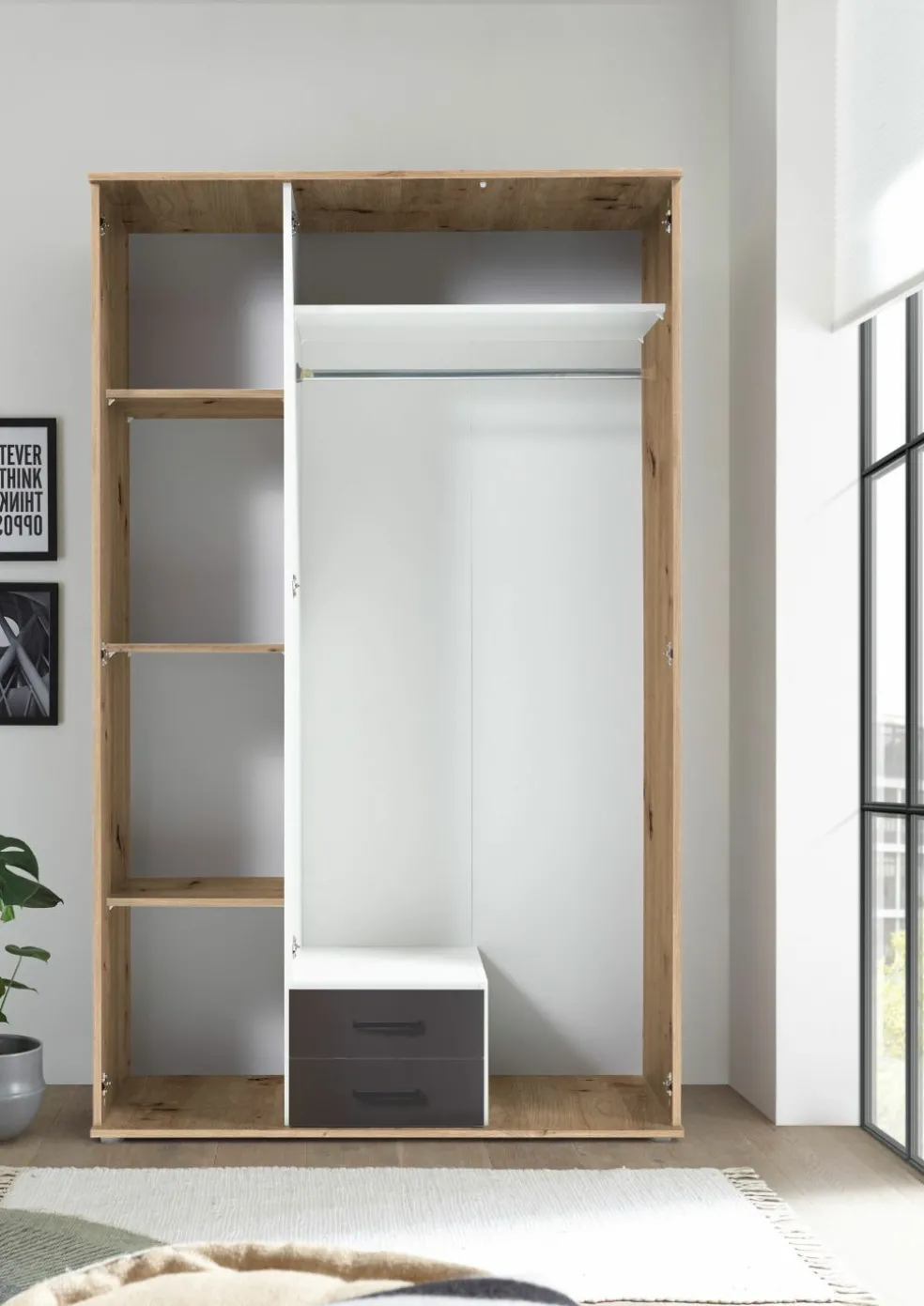 Répartition intérieure : 1 paroi médiane ; à gauche : 3 tablettes ; à droite : 1 tablette et 1 barre de penderie