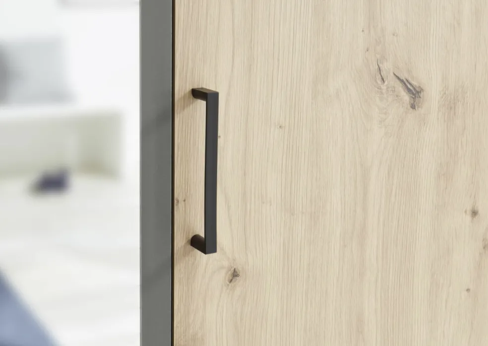 Façade : décor chêne Artisan mélaminé avec contrastes ton anthracite / miroir