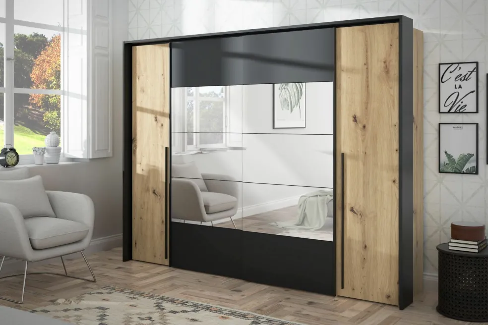 Caisson et façade : décor chêne Artisan et ton noir / miroir