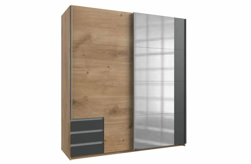 Décor planches de chêne et contrastes (porte de droite et tiroirs) ton graphite / miroir