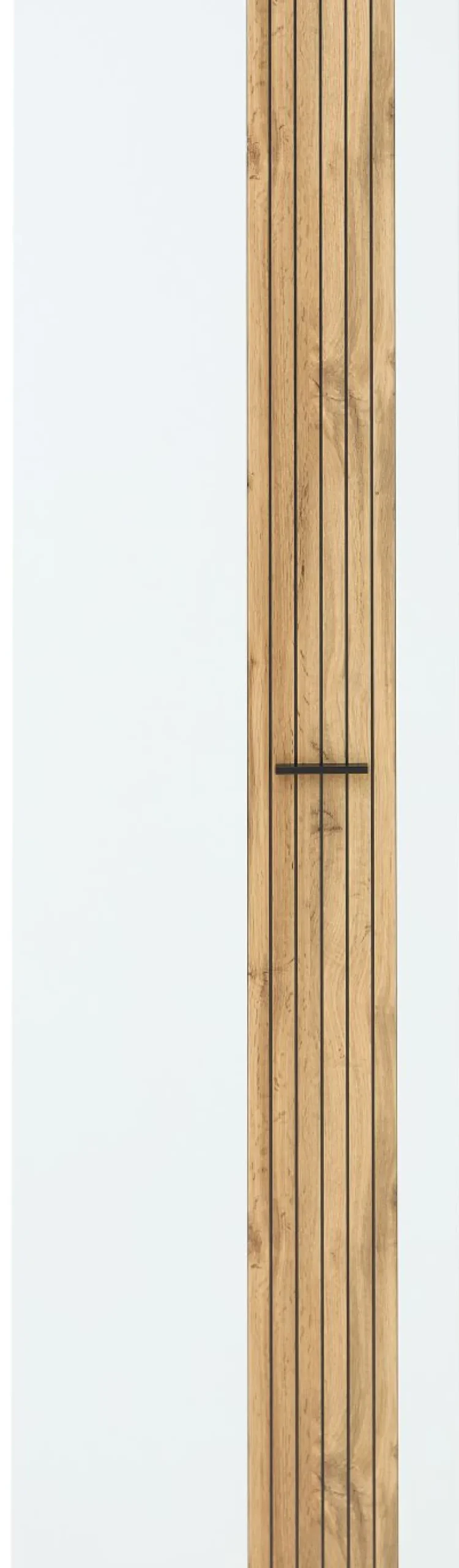 Façade: MDF (panneaux de fibres de bois de densité moyenne) ton blanc super mat et contrastes en MDF ton vieux chêne aspect lattes de bois