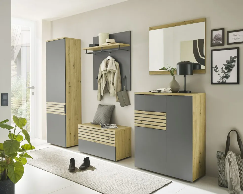 Façade: ton gris avec contrastes et décor rayures chêne Artisan