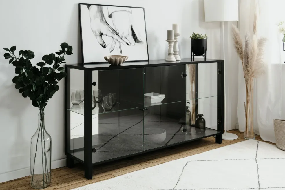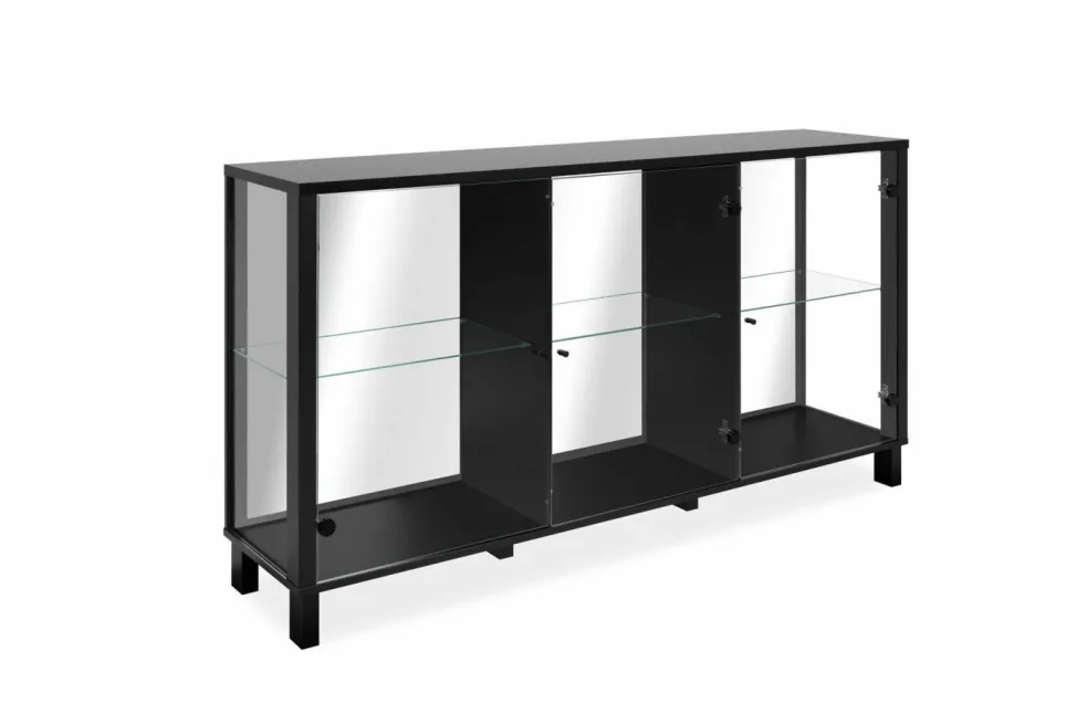Ton noir avec fond miroir; parois latérales et portes en verre