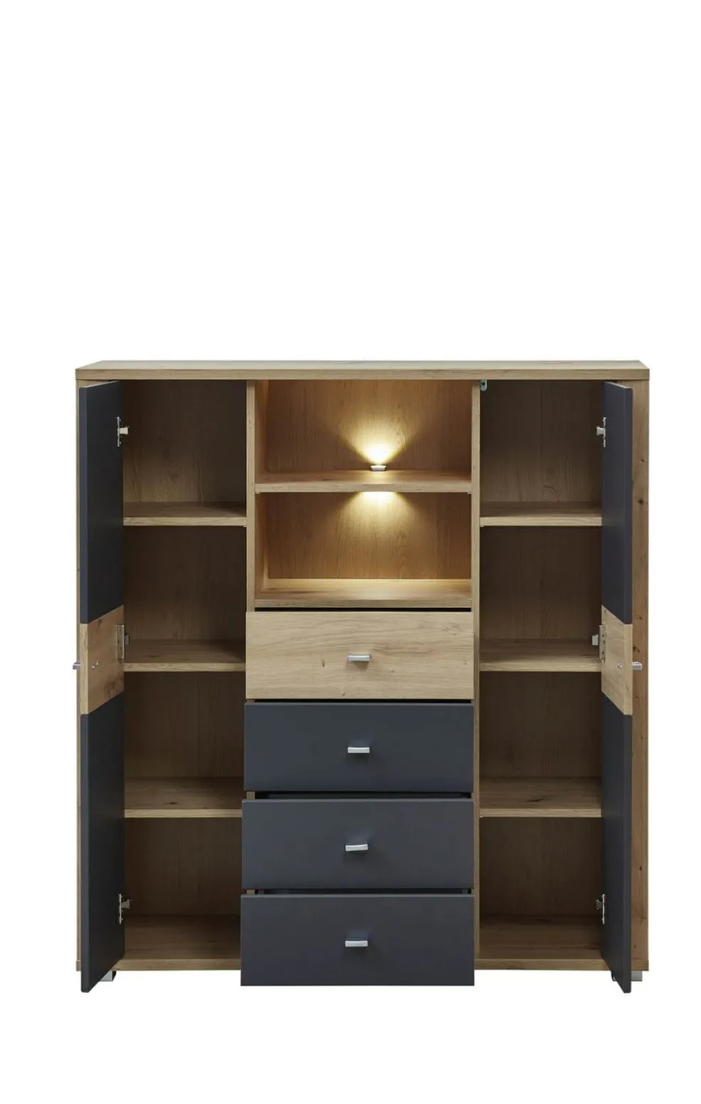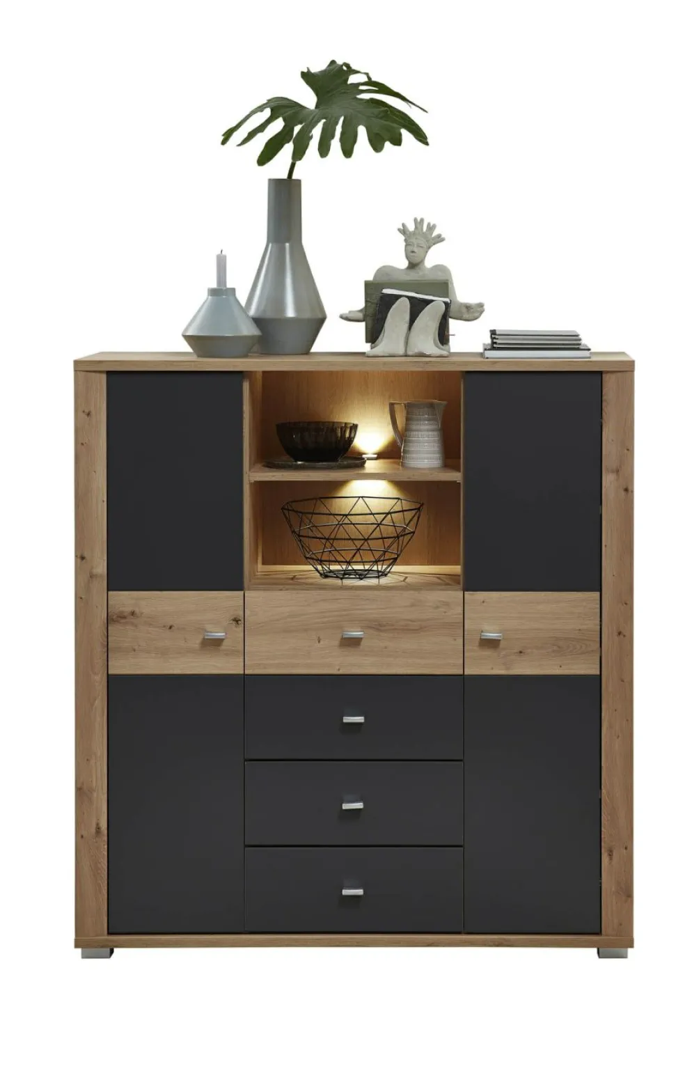 Façade: mélaminé ton graphite avec contrastes décor chêne Artisan