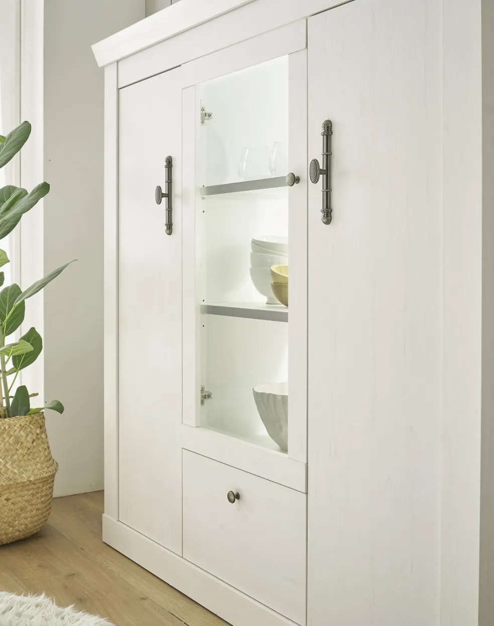1 porte en verre avec encadrement et, derrière elle, 2 tablettes