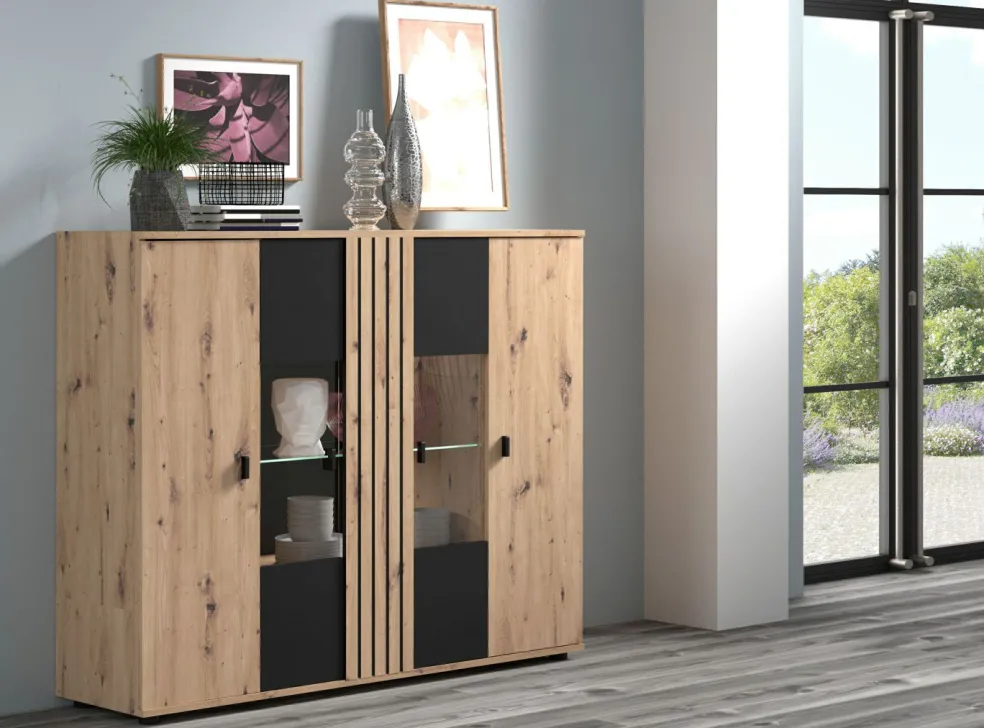 Façade: ton noir avec lamelles décor chêne Artisan