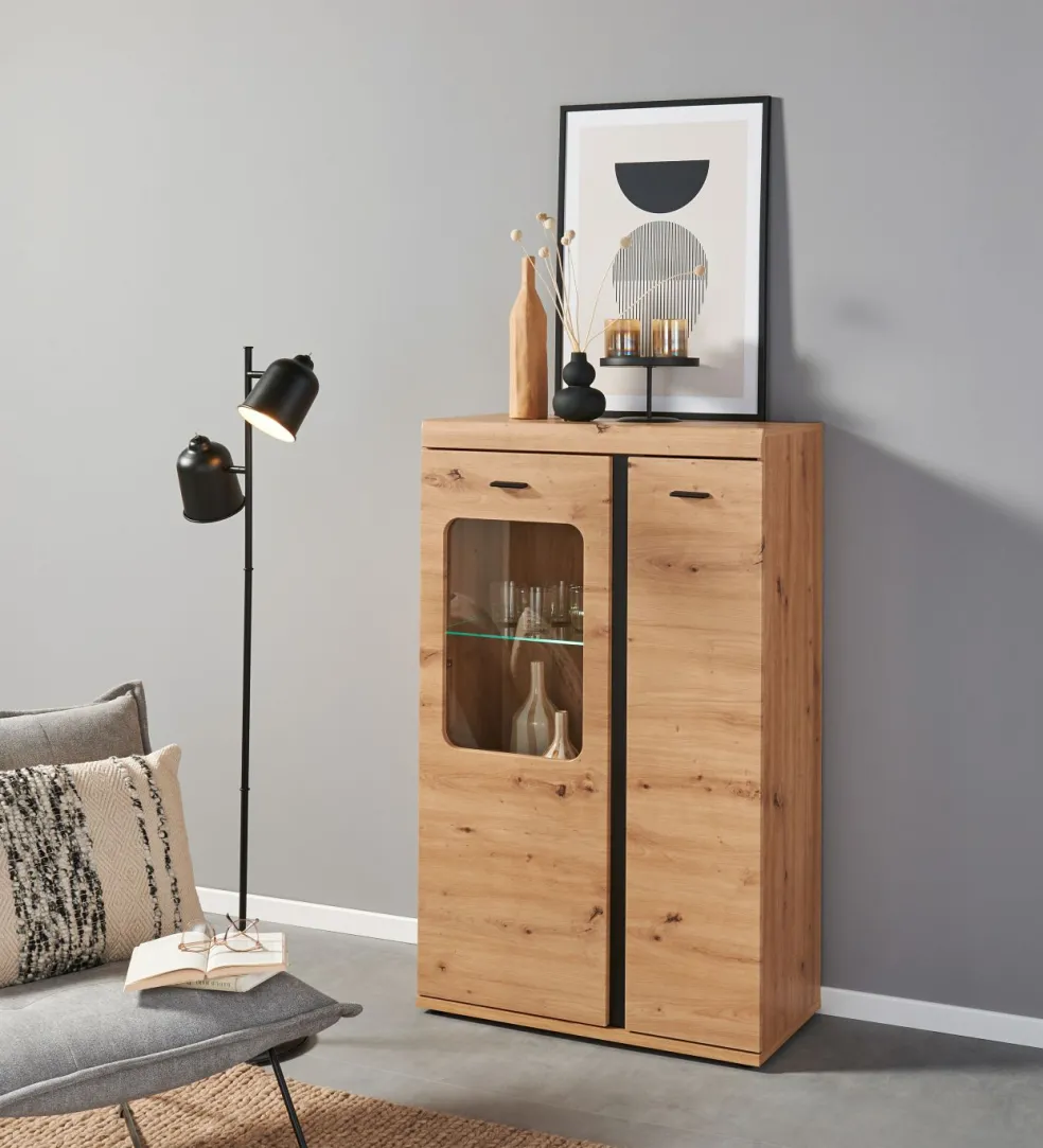 Façade: décor chêne Artisan, MDF (panneau de fibres de bois de densité moyenne) pelliculé avec contrastes ton noir (panneaux de particules mélaminés) / verre