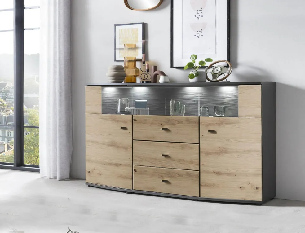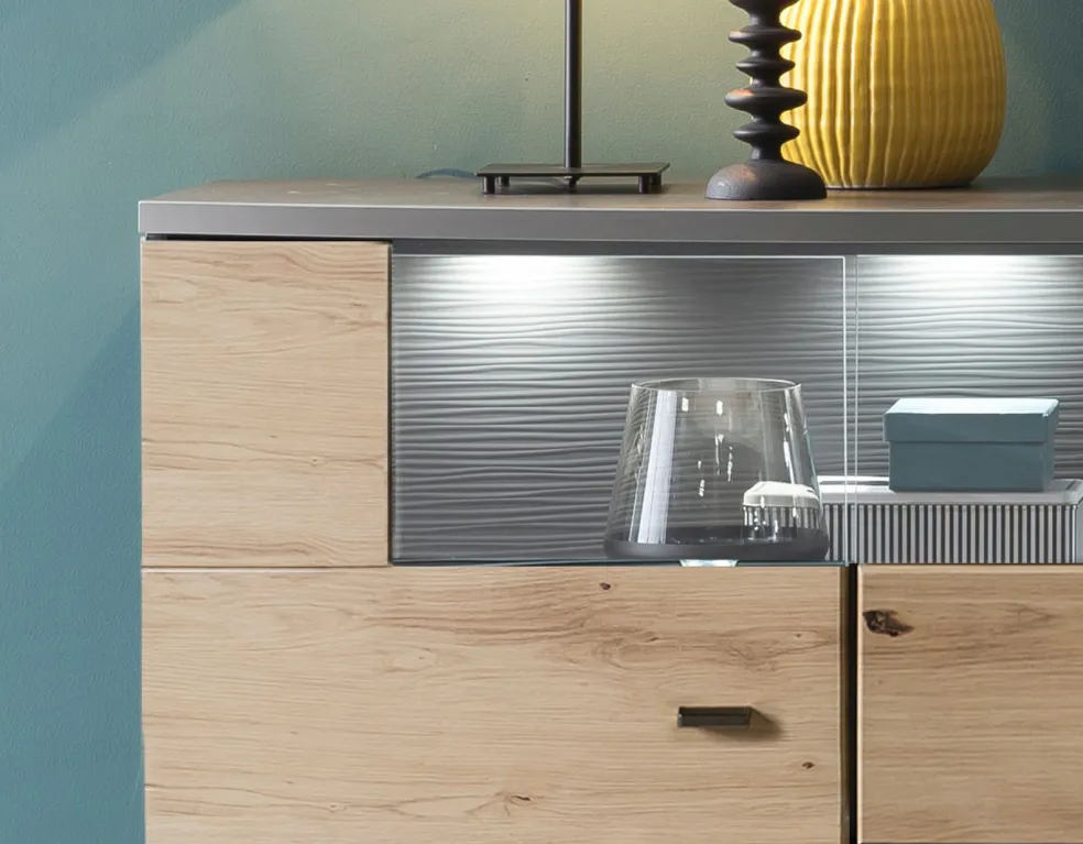 Façade: MDF (panneau de fibres de bois de densité moyenne) décor chêne Artisan avec contrastes ton anthracite / verre