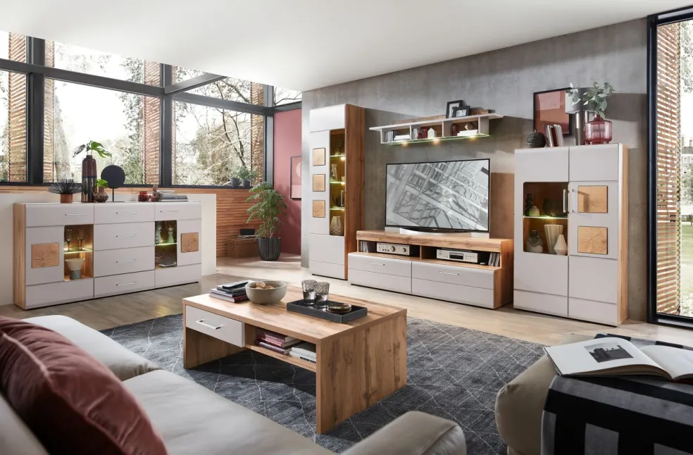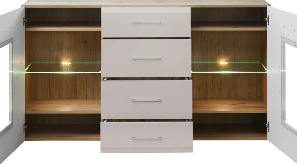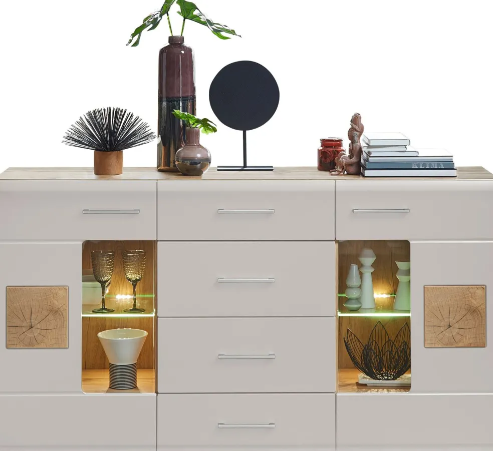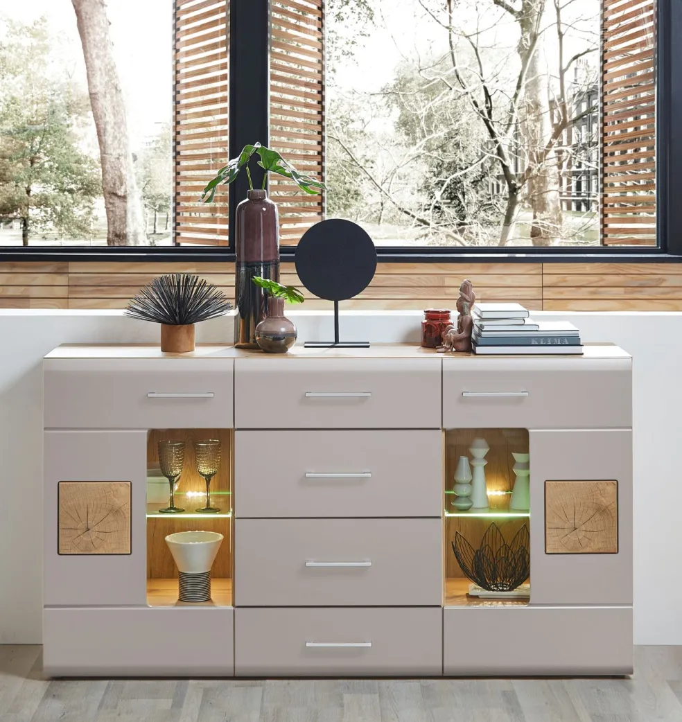 Façade: MDF (panneauen fibre de bois de densité moyenne) ton cachemire mat avec contrastes décor bois de bout / verre transparent