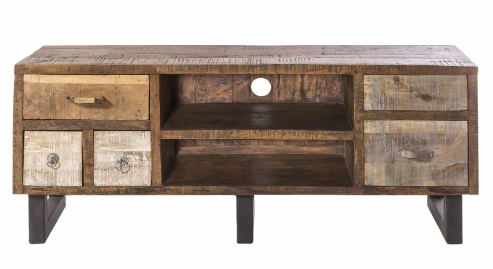 Vieux bois massif recyclé, principalement bois de manguier (Inde) sur piètement traîneau métallique (aspect vintage)