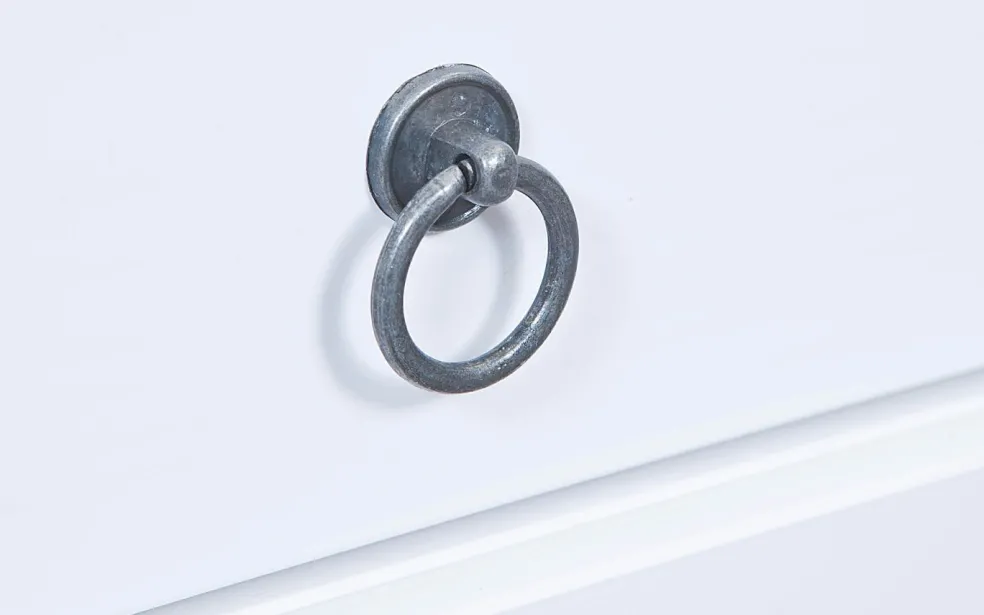 un socle bien marqué et de jolis anneaux aux poignées confèrent à ce meuble TV son élégance classique