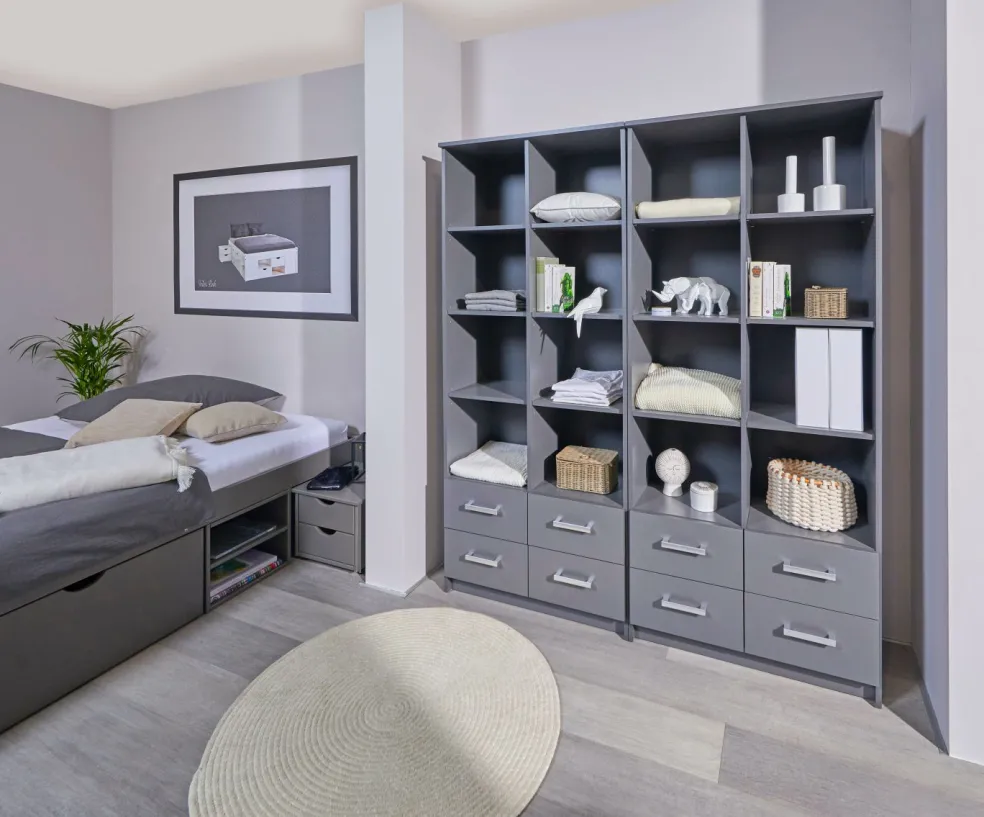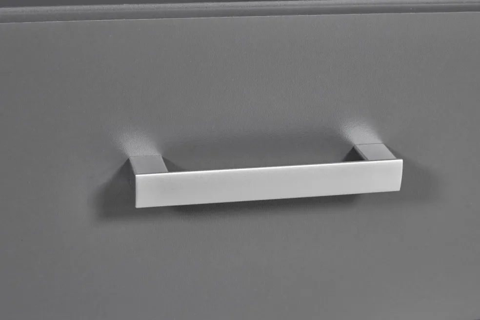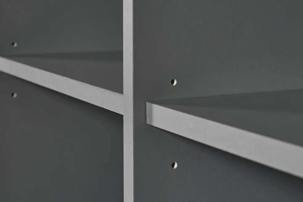 Caisson et façade : en panneaux de particulessurfacésmélaminés(PPSM) robustes,ton gris graphite