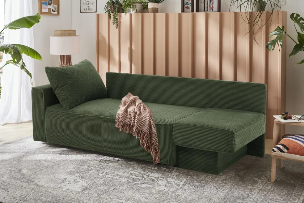 Le canapé se transforme facilement en lit en faisant coulisser l’assise latéralement à l’aide de la dragonne et en basculant l’accoudoir.