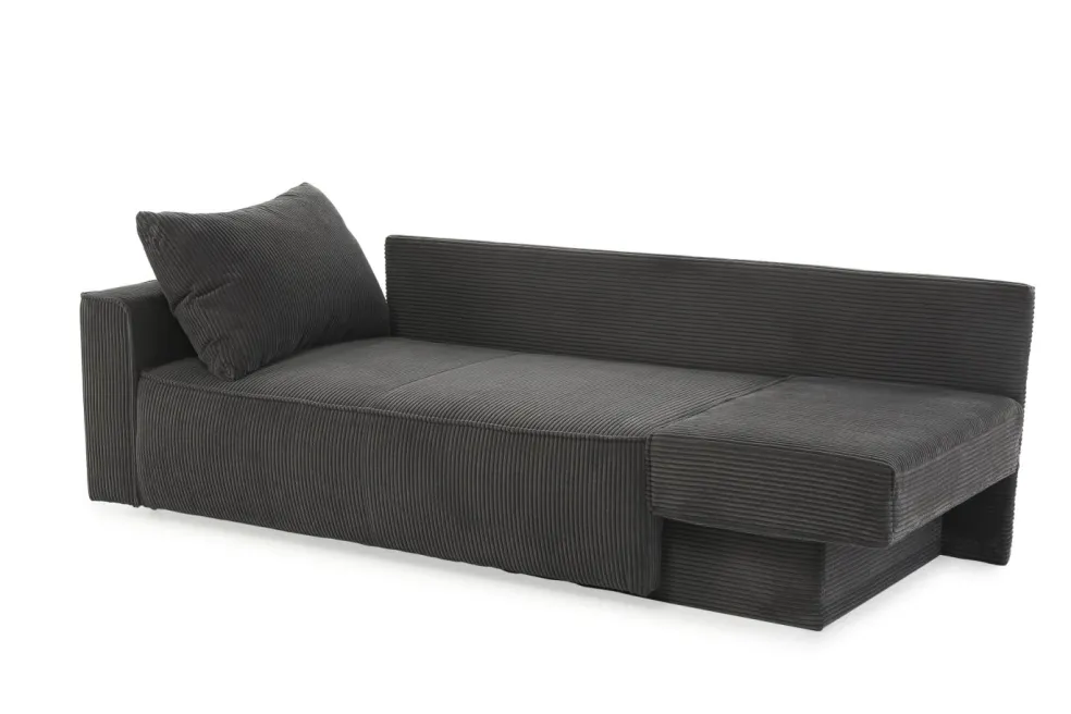 Le canapé se transforme facilement en lit en faisant coulisser l’assise latéralement à l’aide de la dragonne et en basculant l’accoudoir.