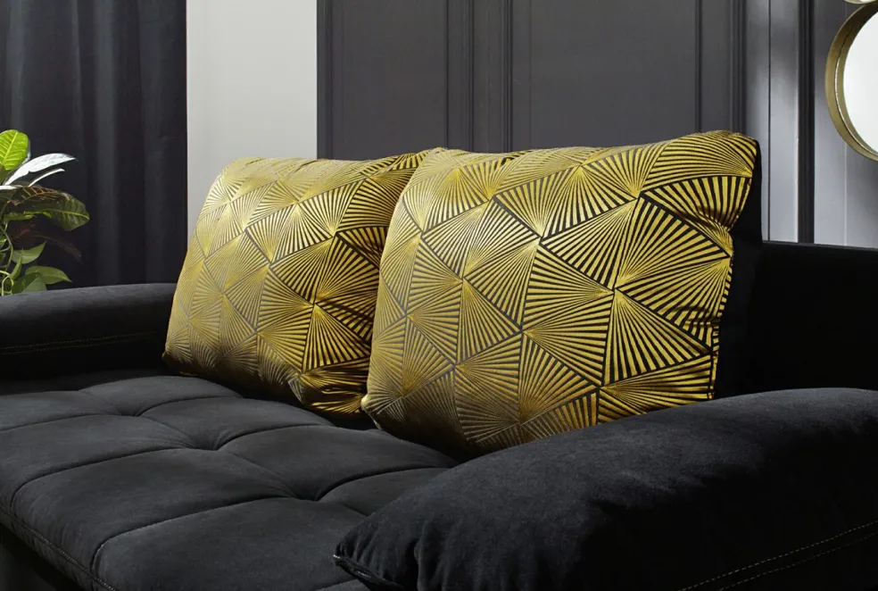 Revêtement: canapé et coussins accoudoirs dans un tissu imitation velours 372/06 ton noir 100% polyester; coussins de dos en tissu Jacquard ton doré/noir 66% polyester et 34% viscose
