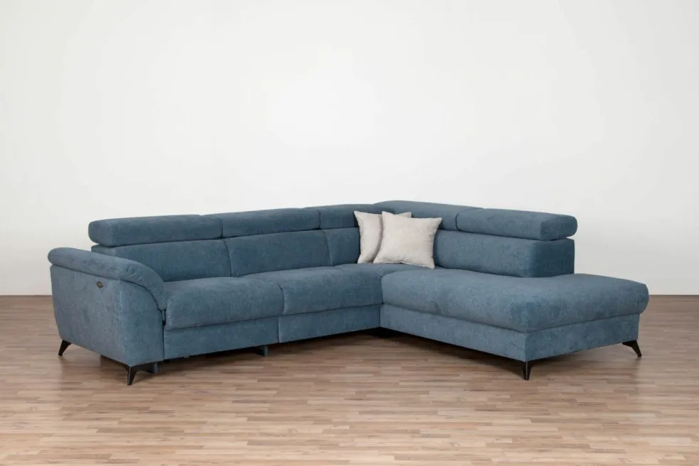 Revêtement : canapé d’angle en tissu 6025 ton bleu-gris 90% polyester et 10% nylon ; coussins décoratifs en tissu 6017 ton beige 100% polyester