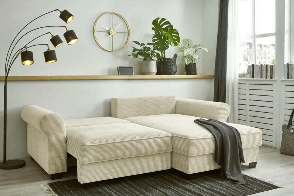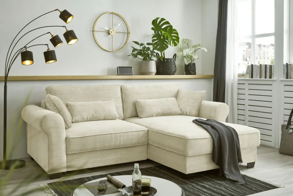 | Equipement canapés: | Dos habillé, Méridienne à droite ou à gauche, incl. coffre de lit, incl. coussins | ||