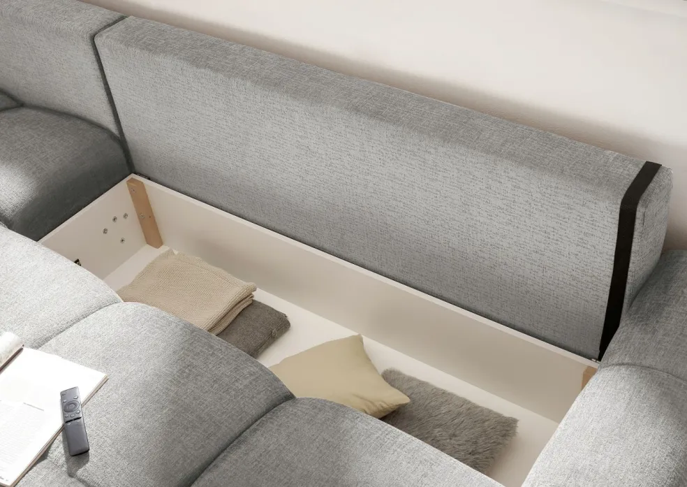 | Equipement canapés: | Dos habillé, Méridienne à gauche, incl. coffre de lit, incl. coussins | ||