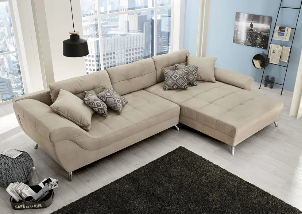 Canapé d’angle ultra tendance aspect nubuck avec une surpiqûre attrayante dans l’assise. Le garnissage de qualité avec suspension nosag, mousse polyéther et couche de mousse haute résilience intégrée garantit un excellent confort d’assise. Grâce à son dos habillé, ce canapé peut être positionné librement dans la pièce.