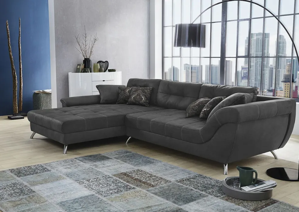 Canapé d’angle ultra tendance aspect nubuck avec une surpiqûre attrayante dans l’assise. Le garnissage de qualité avec suspension nosag, mousse polyéther et couche de mousse haute résilience intégrée garantit un excellent confort d’assise. Grâce à son dos habillé, ce canapé peut être positionné librement dans la pièce.