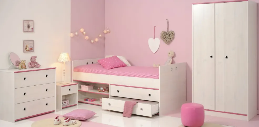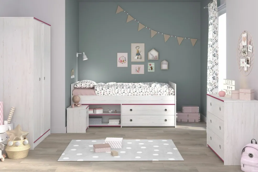 Cette chambre d’ado 4 éléments est proposée dans un coloris clair et créera une ambiance conviviale pour se sentir bien. Les chants ton rose ou bleu lui confèrent un aspect tendance. Le lit confortable avec ses grands tiroirs offre beaucoup de place pour les jouets, les livres et bien plus encore. Un chevet à côté du lit avec un tiroir très pratique permet de faire régner l’ordre. Dans l’armoire à portes battantes, on peut ranger vêtements et accessoires de façon ordonnée. La commode comprise dans l’ensemble, avec ses 3 tiroirs ultra pratiques, offre un espace de rangement supplémentaire.