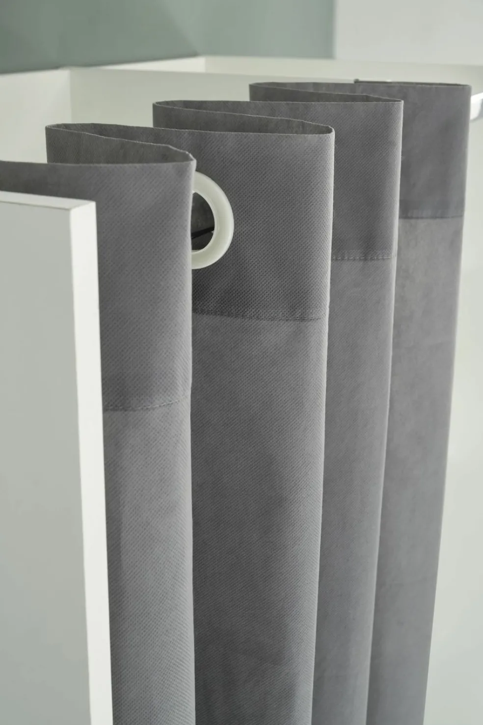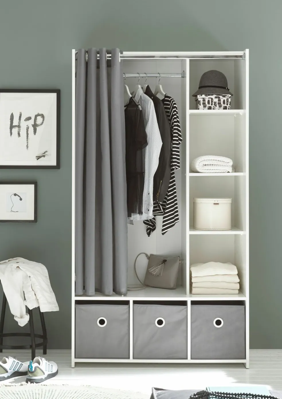 Répartition intérieure : 1 paroi médiane ; à gauche : 1 barre de penderie, à droite : 3 tablettes, en bas: 3 casiers avec boîtes de rangement